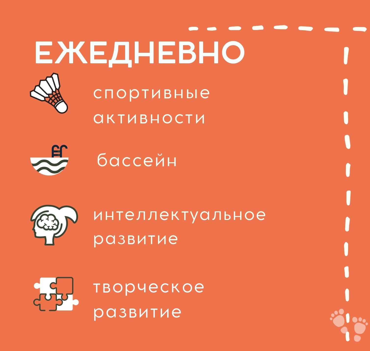 Ежедневное плавание в бассейне в хорошую погоду. Очень доброжелательное и уважительное отношение к детям. Сынок остался доволен и просится ещё. Рекомендую!